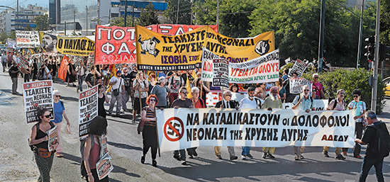 Ταυτόχρονα, όλο το 2012-13 τα τάγματα της Χ.Α αποθρασυμένα από την εκλογική επιτυχία και την κρατική χρηματοδότηση δρουν ανεξέλεγκτα, μαχαιρώνουν, δολοφονούν, τρομοκρατούν, χρησιμοποιώντας σαν βάσεις τους τα γραφεία τους –ακόμη και αστυνομικά τμήματα, όπως του Αγίου Παντελεήμονα και της Νίκαιας- όπως αποδείχθηκε στη δίκη της Χ.Α. Είναι αυτό το διάστημα που εκτινάσσονται οι ρατσιστικές επιθέσεις κάνοντας ακόμη και τους εκπροσώπους του ΟΗΕ στην Ελλάδα να δηλώνουν: «Σημαίνουμε συναγερμό. Κρούουμε τον πιο δυνατό κώδωνα κινδύνου».