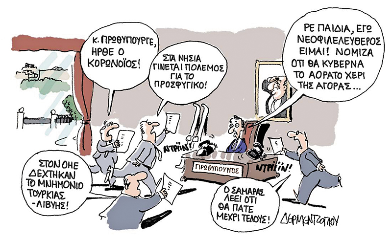 Σπάνια οι γελοιογράφοι έχουν τόσες ευκαιρίες να κάνουν πάρτι με μια κυβέρνηση και τους υπουργούς της -και μάλιστα λίγους μήνες μετά τις εκλογές- όσο αυτές που βλέπουμε τις τελευταίες βδομάδες. Ο Δερμεντζόγλου στο TVXS έκανε ίσως την πιο συνολική ατάκα, με τον Μητσοτάκη να λέει «Νόμιζα ότι θα κυβερνά το αόρατο χέρι της αγοράς», αλλά τον συναγωνίζονται οι δημοσιογράφοι που έκαναν τίτλο το «Τους πήρε το Διαβολόρεμα».1 Το βραβείο, όμως, το κερδίζει η Βουλή όπου όλες οι πτέρυγες ξέσπασαν σε γέλια όταν ο Γεραπετρίτης έκανε τη δήλωση ότι τα ΜΑΤ δεν απεσύρθησαν από Χίο-Μυτιλήνη, απλά «ολοκλήρωσαν το έργο τους»!