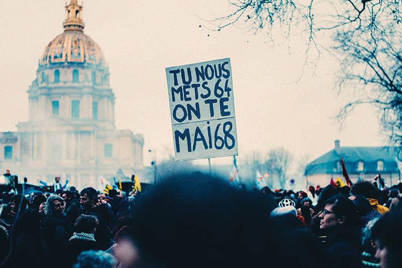 Στις πρόσφατες διαδηλώσεις, ένα πράγμα που προκαλεί εντύπωση είναι η οργή των εργαζομένων για τη συνδικαλιστική γραφειοκρατία που δεν καλεί σε απεργίες μεγαλύτερης διάρκειας, αλλά επιλέγει 24ωρες απεργίες. Δεν είναι ασυνήθιστο οι εργαζόμενοι να κρατούν πικέτες και πανό με το σύνθημα «Γενική Απεργία». Ένα άλλο σύνθημα που αντικατοπτρίζει ξεκάθαρα την αποφασιστικότητα του εργατικού κινήματος είναι: "Tu nous mets 64, on te mai 68". Πρόκειται για ένα λογοπαίγνιο που μεταφράζεται περίπου ως εξής: αν μας αναγκάσετε να συνταξιοδοτηθούμε στα 64, θα φέρουμε πίσω το Μάη του '68.