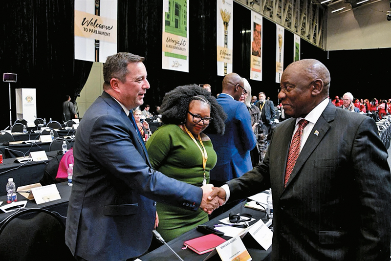 Ο Σίριλ Ραμαφόζα σφίγγει το χέρι του αρχηγού του Κόμματος των Λευκών ύστερα από τον σχηματισμό Κυβέρνησης Εθνικής Ενότητας