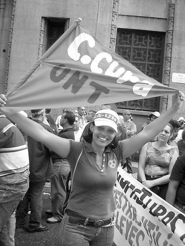 Η UNT είναι η νέα συνδικαλιστική συνομοσπονδία που γεννήθηκε μέσα από τους αγώνες ενάντια στο πραξικόπημα και το λοκ-άουτ των αφεντικών το 2002. Συσπείρωσε εκατοντάδες χιλιάδες εργάτες που έκαναν στην άκρη τα εργοδοτικά συνδικάτα. Στο συνέδριό της που έγινε πέρσι τον Απρίλη, το «αυτόνομο επαναστατικό ταξικό ρεύμα» το C-CURA πήρε την πλειοψηφία. (Στο ΣαΚ Νο 58 δημοσιεύσαμε συνέντευξη του Σ. Πέρεζ Μπόρχες, ενός από τους εθνικούς συντονιστές της συνομοσπονδίας και του επαναστατικού ρεύματος στο εσωτερικό της). Το συνέδριο δίχασε την UNT επειδή η μειοψηφία που είναι δεμένη με το μηχανισμό της κυβέρνησης επέμενε στην αναβολή του για μετά τις προεδρικές εκλογές. Ωστόσο η UNT συνεχίζει να δίνει τις μάχες της. Βοήθησε για παράδειγμα να οργανωθεί μια διαδήλωση στο Καράκας στις 21 Δεκέμβρη όπου στην πρώτη γραμμή ήταν οι εργάτες της Sanitarios Maracay ενός εργοστασίου ειδών υγιεινής στην Πολιτεία της Αράγκουα. Το αφεντικό εγκατέλειψε το εργοστάσιο, αφού απέτυχαν οι προσπάθειές του να διαλύσει το σωματείο. Οι εργάτες έχουν καταλάβει εδώ και μήνες το εργοστάσιο, έχουν ξεκινήσει την παραγωγή με εργατικό έλεγχο και απαιτούν την εθνικοποίησή του. Στο πλευρό τους βάδισε και μια μεγάλη αντιπροσωπία των εργατών της Sidor.