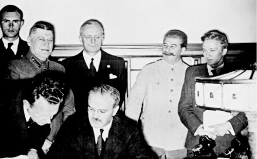 Όταν οι κυβερνήσεις των δύο αυτών «δημοκρατικών δυνάμεων» διάλεξαν το συμβιβασμό με τον Χίτλερ μέσα από τις Συμφωνίες του Μόναχου, η εξωτερική πολιτική του Στάλιν εξαναγκάστηκε σε άλλη μια απότομη στροφή, τη χειρότερη απ’ όλες. Το Σύμφωνο Μολότοφ - Ρίμπεντροπ, που υπογράφτηκε στη Μόσχα τον Αύγουστο του 1939 ανάμεσα στους υπουργούς Εξωτερικών της ΕΣΣΔ και της ναζιστικής Γερμανίας, ήταν κεραυνός στο κεφάλι όλων των αριστερών σε όλο τον κόσμο λίγο πριν ξεσπάσει ο Β’ Παγκόσμιος Πόλεμος. Χειρότερη ιδεολογική προετοιμασία για τα Κ.Κ δύσκολα μπορεί να φανταστεί κανένας. Όσο για την αποτροπή του πολέμου, μέσα στους 17 μήνες που κράτησε το Σύμφωνο, η ΕΣΣΔ προμήθευσε τη Γερμανία με 865.000 τόνους πετρέλαιο, 648.000 τόνους ξυλεία, 14.000 τόνους χαλκού και 1,5 εκατομμύριο τόνους σιτηρά. Η πολεμική μηχανή των Ναζί ετοιμαζόταν να εισβάλει στην ΕΣΣΔ με υλικά που προμήθευσε το Σύμφωνο του Στάλιν.